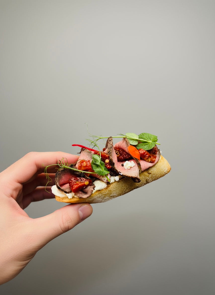 - 4 bruschettas with roast beef, pickled cucumber & mustard cream