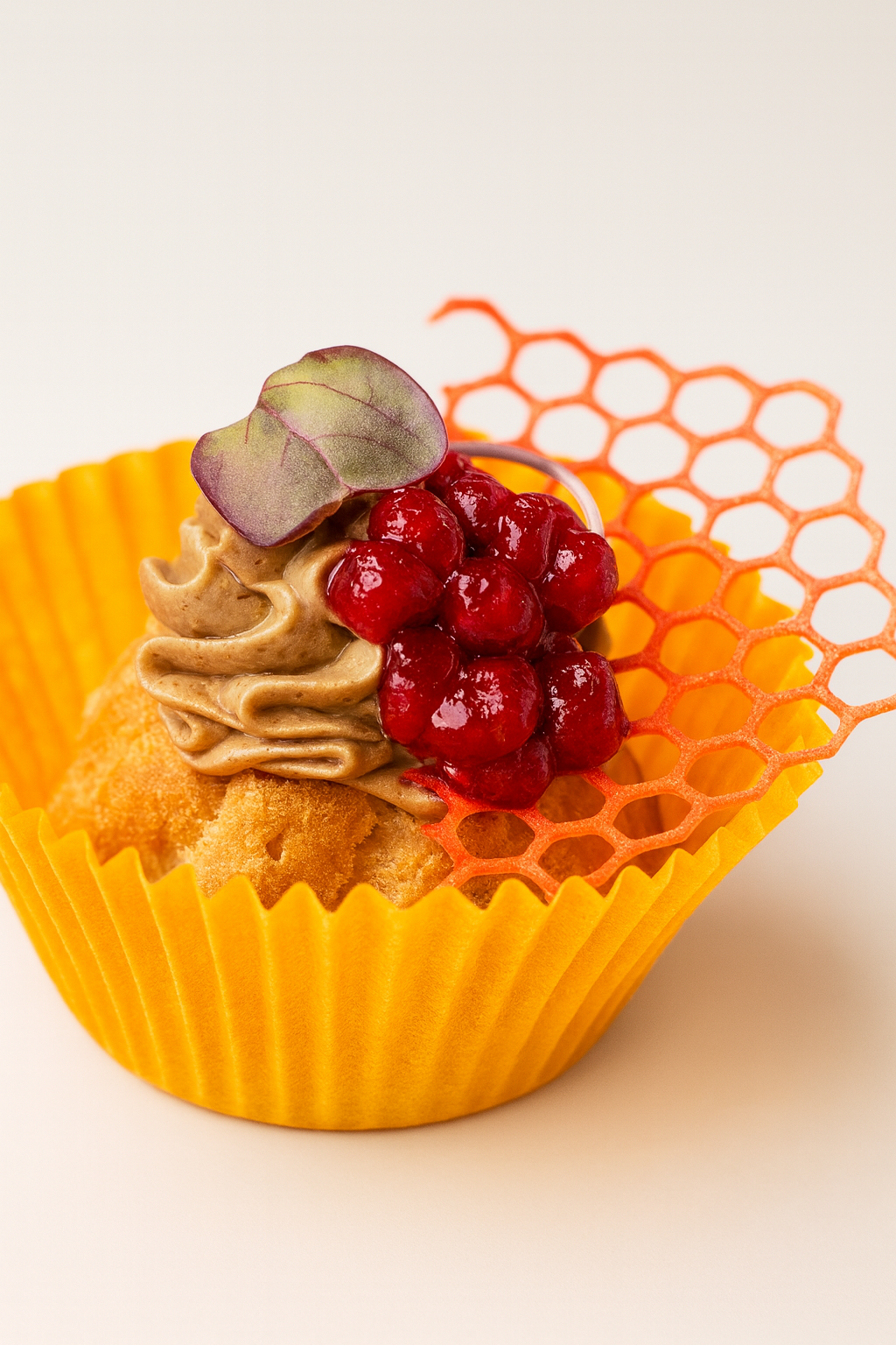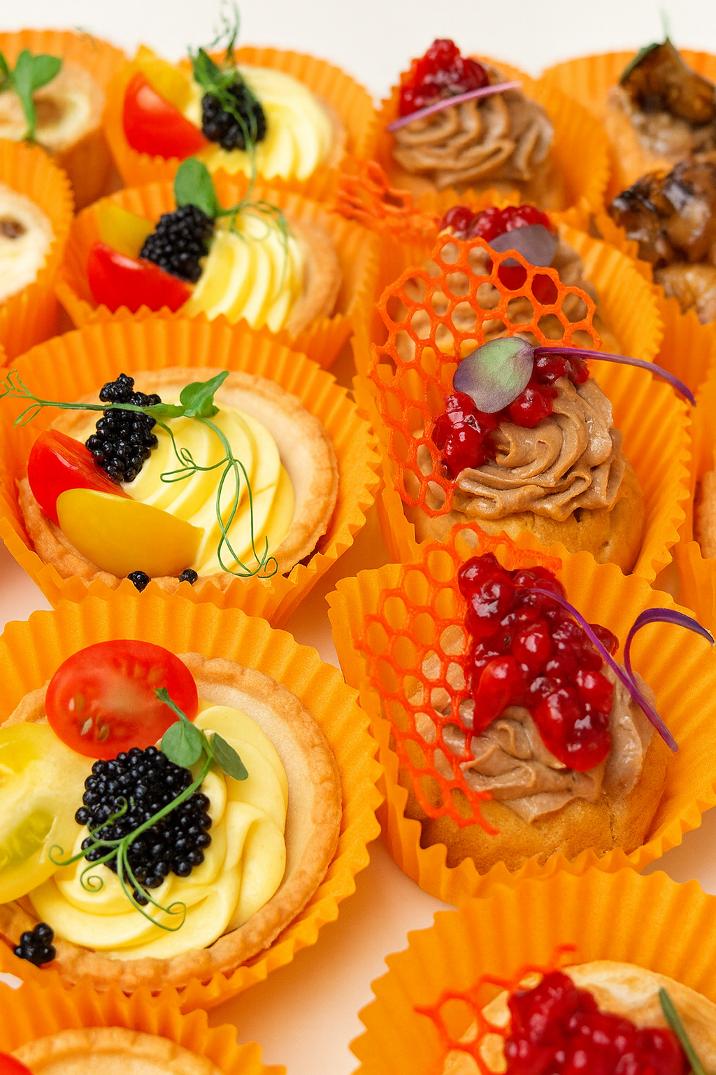 - 5pcs-Profiteroles with chicken liver mousse and lingonberry glaze